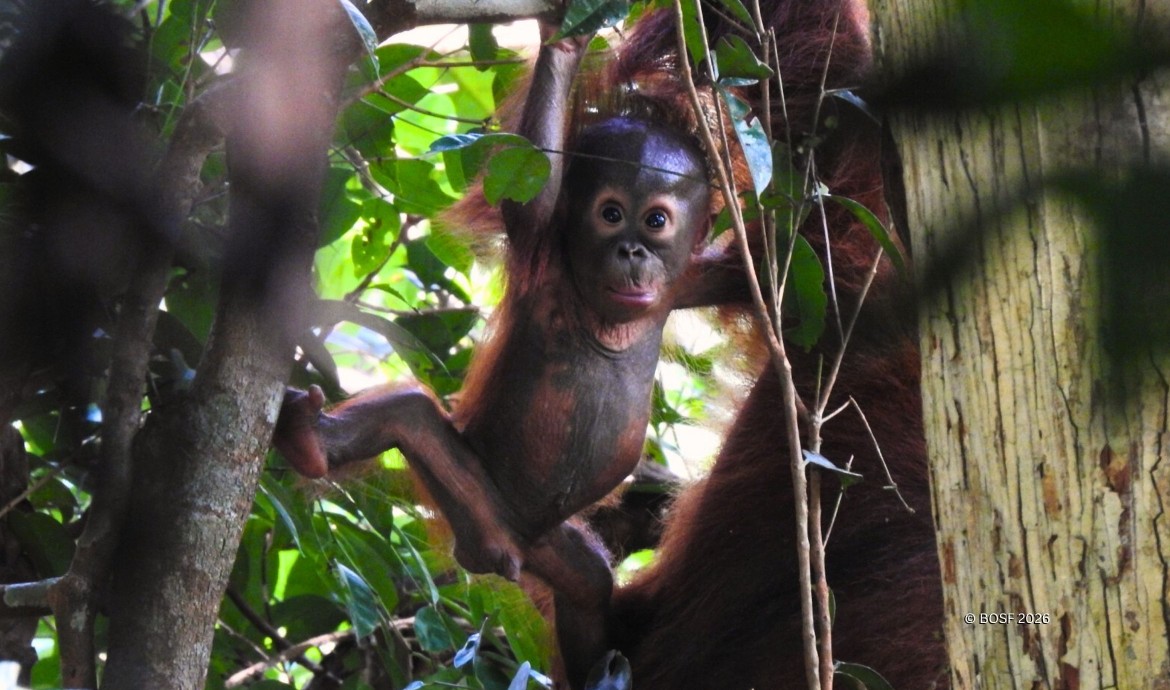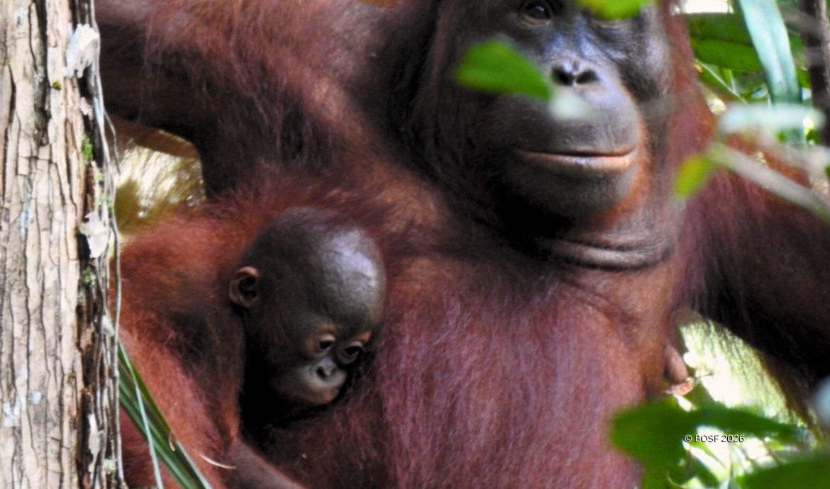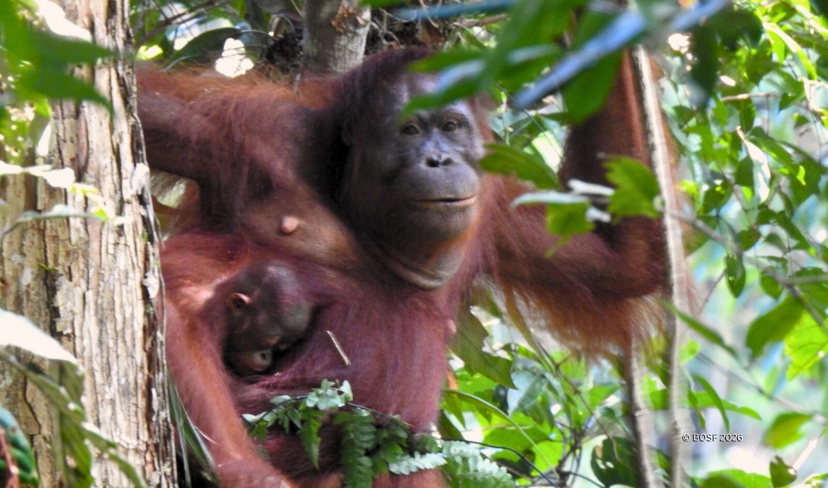 Efforts to monitor orangutans in the wild have once again delivered heartening news. Our Post-Release Monitoring (PRM) Team recently encountered a female orangutan strongly believed to be Agis, a rehabilitated individual from the Borneo Orangutan Survival Foundation (BOS Foundation) who was released into Bukit Baka Bukit Raya National Park (TNBBBR) in 2018. Even more encouraging, Agis was observed carrying an infant orangutan estimated to be around 6–8 months old.