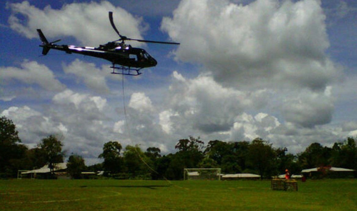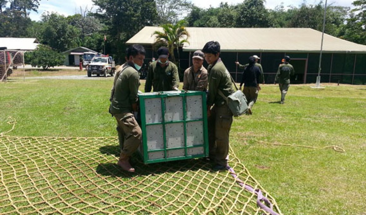 At IMK, sling load net was set up and all the travel cages were loaded and secured. Around 8 AM, the Squirrel helicopter took off, bringing Edwan, Klowor, Rachmad and Darsi to their new home in Bukit Batikap.
