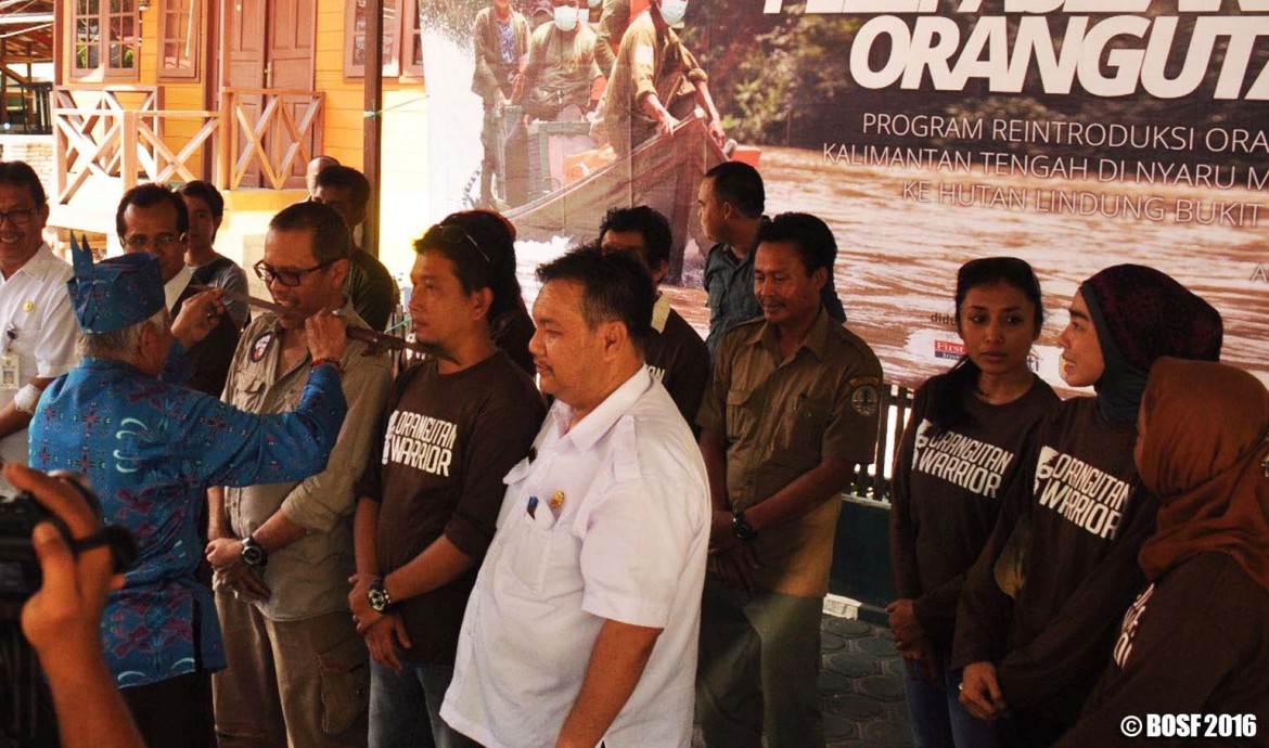 Prosesi adat “Tampung Tawar” sebagai bentuk dukungan masyarakat setempat terhadap pelepasliaran orangutan rehabilitasi BOS Foundation Nyaru Menteng ke habitatnya di Hutan Lindung Bukit Batikap.
