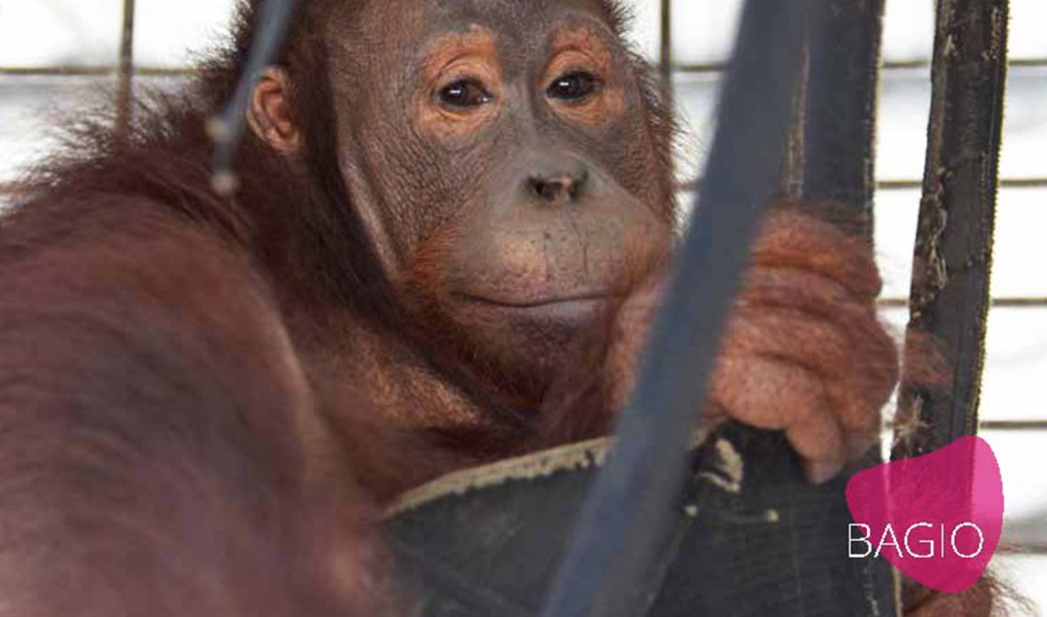 Bagio diserahkan kepada BOS Foundation oleh BKSDA Kalimantan Tengah dan tiba di BOSF Nyaru Menteng pada 6 November 2013. Saat itu Bagio berusia 5 tahun, dan dinyatakan diselamatkan oleh seorang warga Kota Palangka Raya di hutan kecil yang mengalami pembukaan lahan. Orangutan jantan ini datang dengan kondisi yang memperihatinkan; berat badannya hanya 6,4 kg dan mengalami dehidrasi. Ada luka sobek segar di pelipis mata kirinya dan tulang paha kirinya patah, dia juga masih menunjukkan perilaku liar.