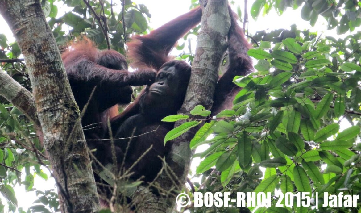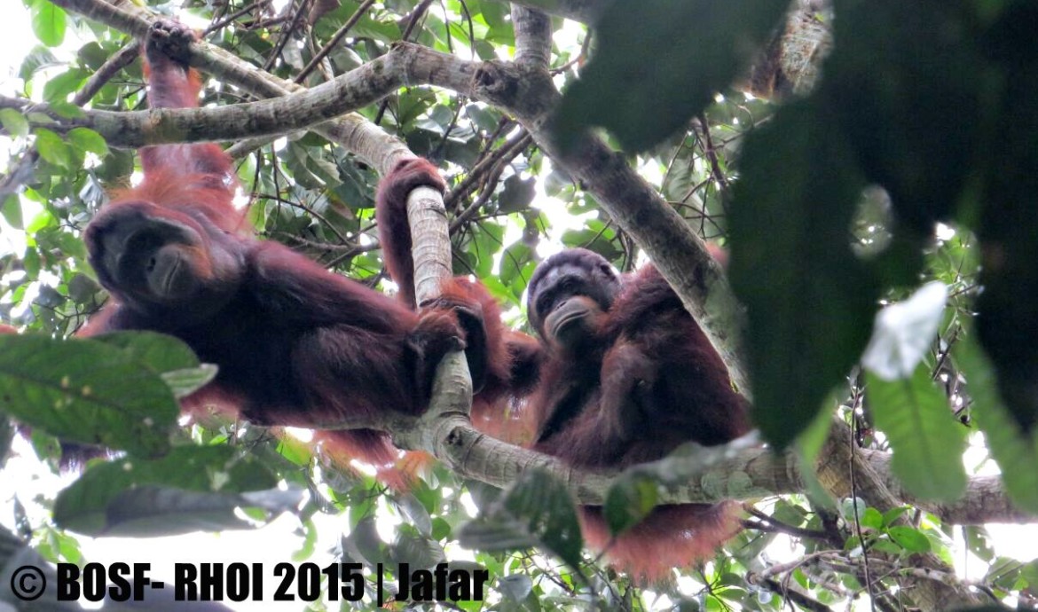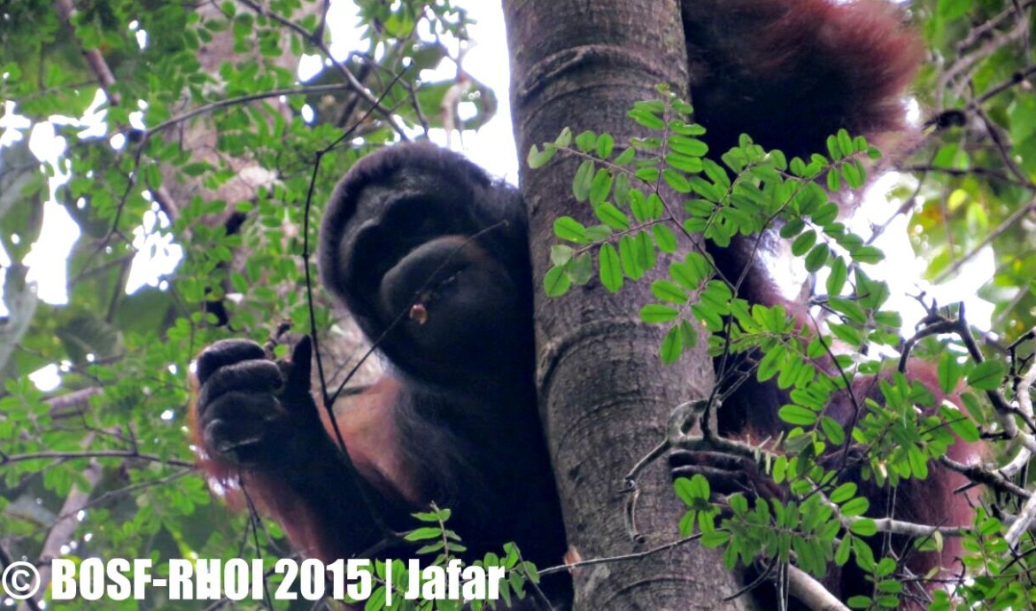 Mona was also very active moving from tree to tree. While watching Mona swinging around, we were surprised to see another individual sitting on a higher branch of a tree. It was Juminten! Just like Mona, Juminten was also in good condition and very active. Mona and Juminten hung out together for quite some time, sharing fruits and clearly enjoying each other’s company.