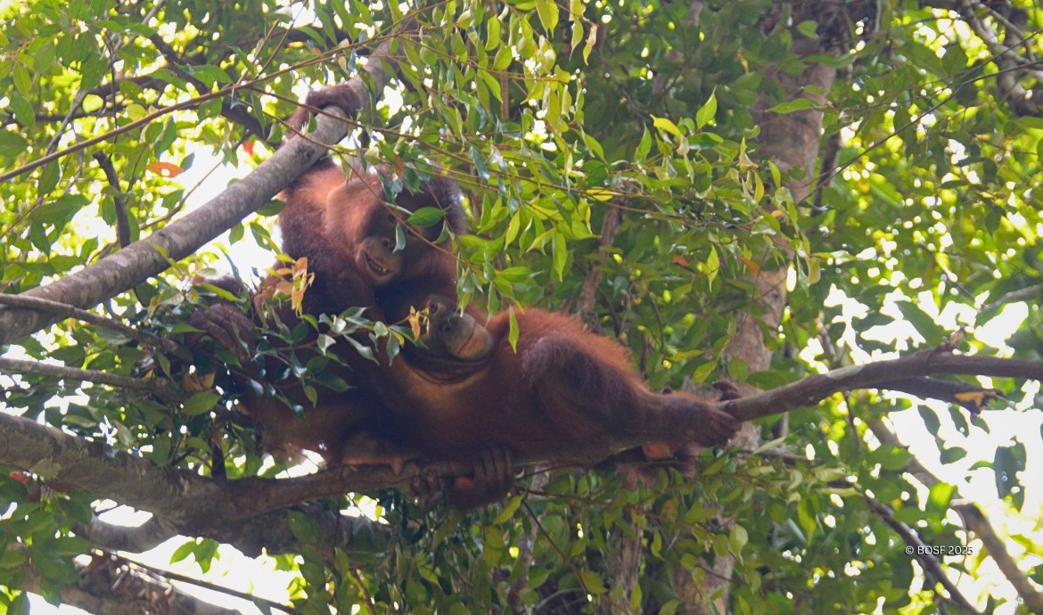 It is not uncommon for Aiko and Jenny to search for each other when the coucal’s call suddenly echoes through the forest. Interestingly, even though they are afraid, they also seem to find comfort in each other’s presence. Sometimes, they express their unease by making a kiss squeak vocalization, a sound orangutans use to show discomfort, while shaking nearby branches.