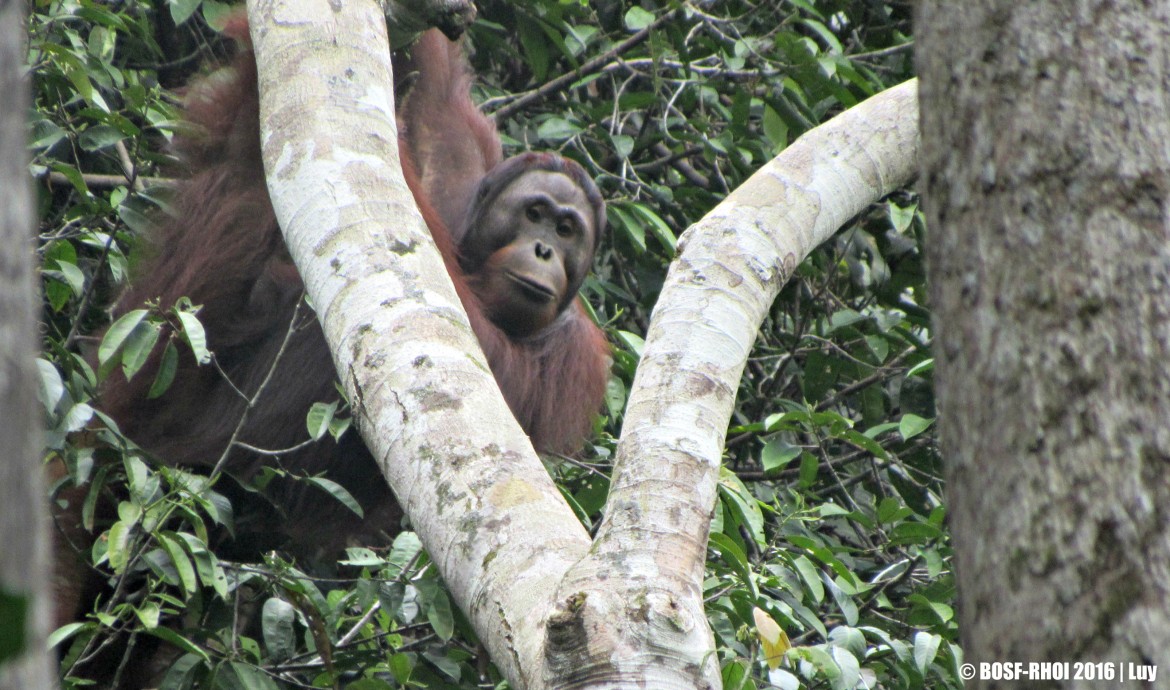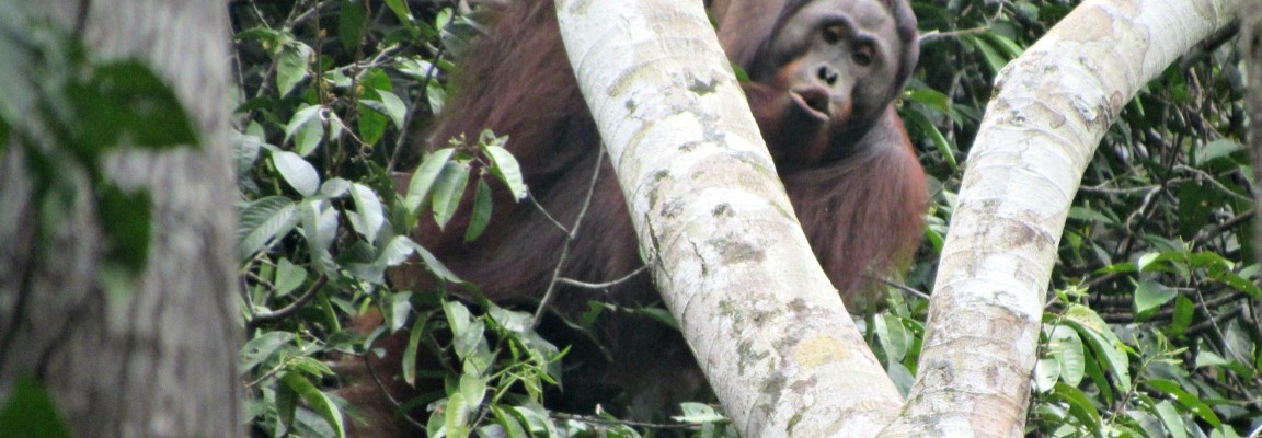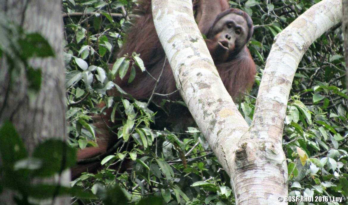 After concluding our release-point survey, we joined the PRM team’s daily meeting at Nles Mamse Camp. Here we heard about an unknown wild male orangutan the PRM team had observed living in the southern area of the Kehje Sewen Forest. The team had seen him spending time with Leonie, a female orangutan who was released in September 2015. The team planned to keep monitoring the dynamic between the two.