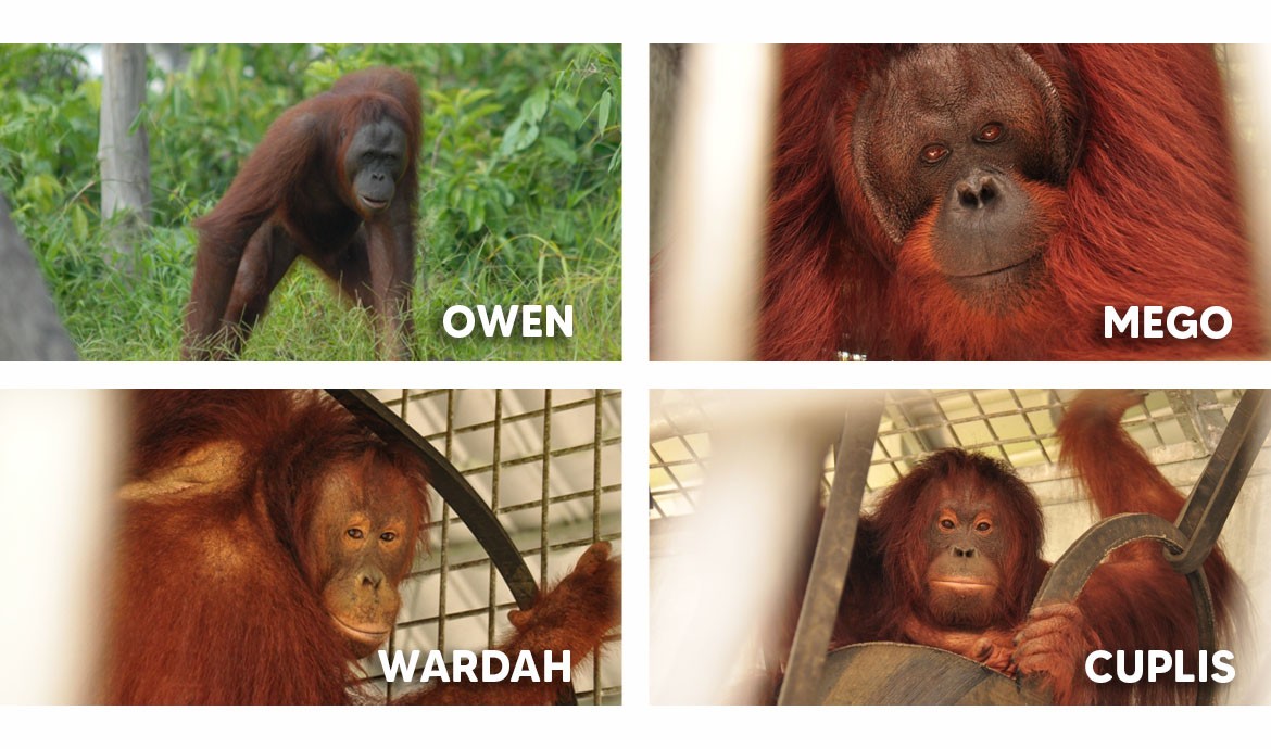 Mego yang memiliki mata bulat ini lulus dari Sekolah Hutan dan menjalani tahap pra-pelepasliaran pada 2005 di Pulau Palas. Mego adalah orangutan jantan dominan dengan bantalan pipi yang kini mulai tumbuh menghiasi wajahnya.