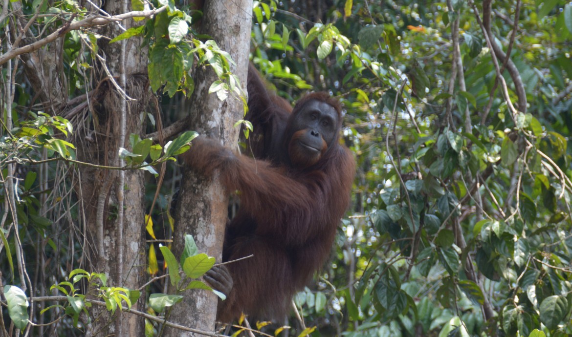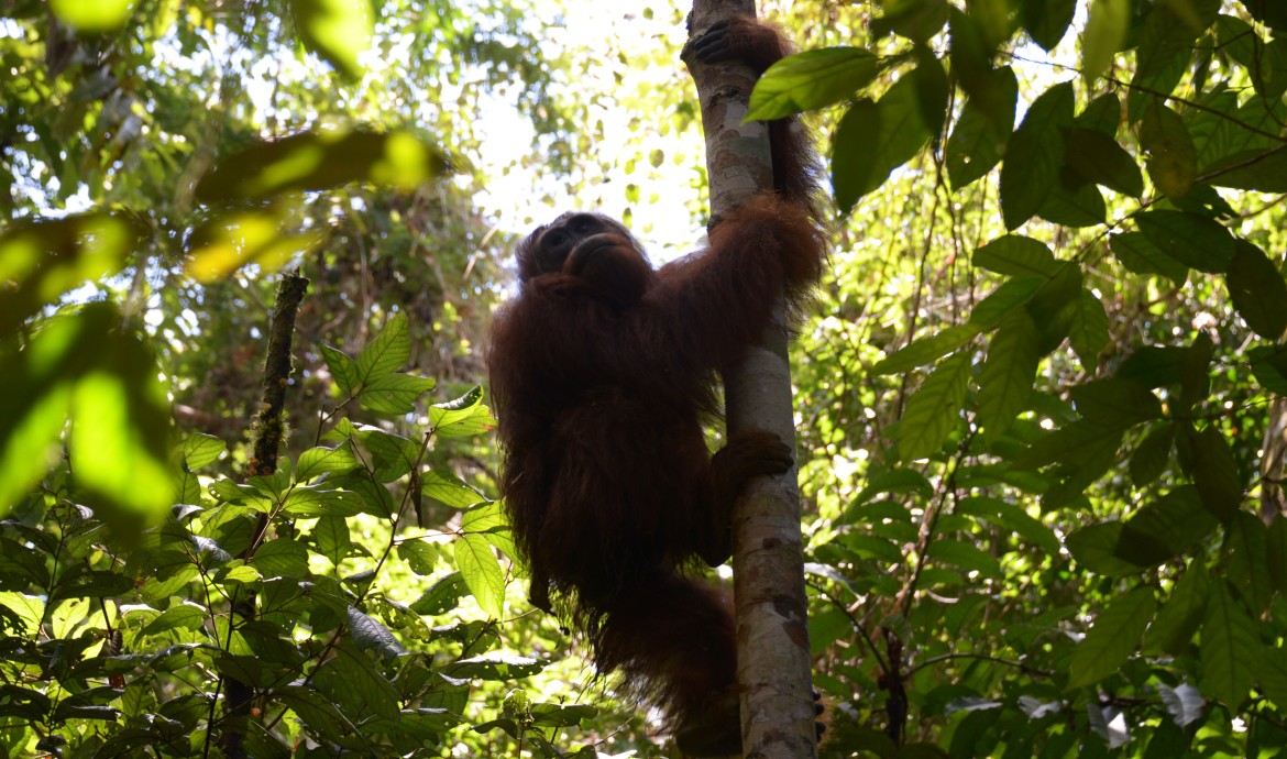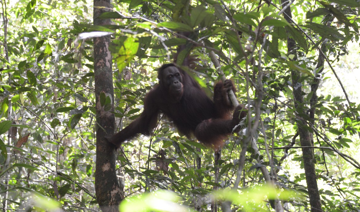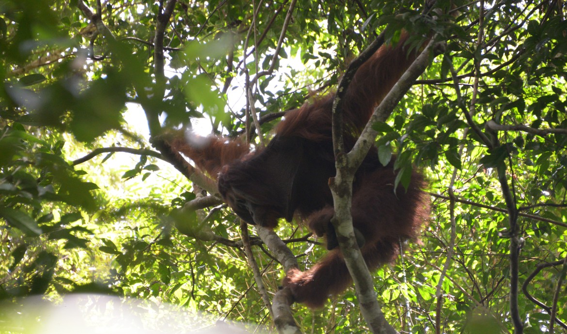 Unlike Paijah, who chose to rest after the long journey from Nyaru Menteng, Danida set off to explore her new environment from the very first day she was released in the forest. She moved swiftly from one tree to another, taking in the atmosphere of her new playground! She kiss-squeaked every time she spotted our PRM team members on the forest floor below, voicing her displeasure at their presence. Danida started to seriously forage in the afternoon and was seen spending time with Tristan.