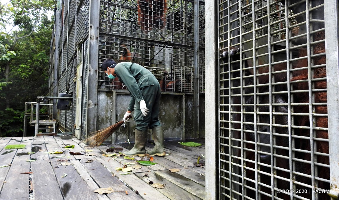 The feeding schedule for orangutans at our rehabilitation centres and on pre-release islands is also still the same: twice daily, in the morning and late afternoon. The same goes for the cleaning of orangutan enclosures, with routine, scheduled cleaning being carried out in the morning and late afternoon. We also maintain a strict regime of spraying disinfectant around the compound and enclosures three times a week to ensure a clean and healthy environment.