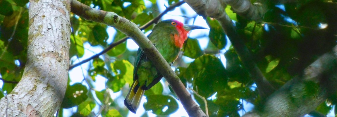 The Red-bearded Bee-eater is a medium-sized bird belonging to the bee-eater family (Meropidae). It can be recognized by its vibrant plumage: a predominantly green body, a bright red throat and “beard” that extends down the chest, and a strong, slightly curved bill adapted for catching insects. Its tail is relatively long with central feathers extending beyond the others, a typical feature among bee-eaters. This colourful appearance makes the species one of the most visually striking birds in Southeast Asian forests.