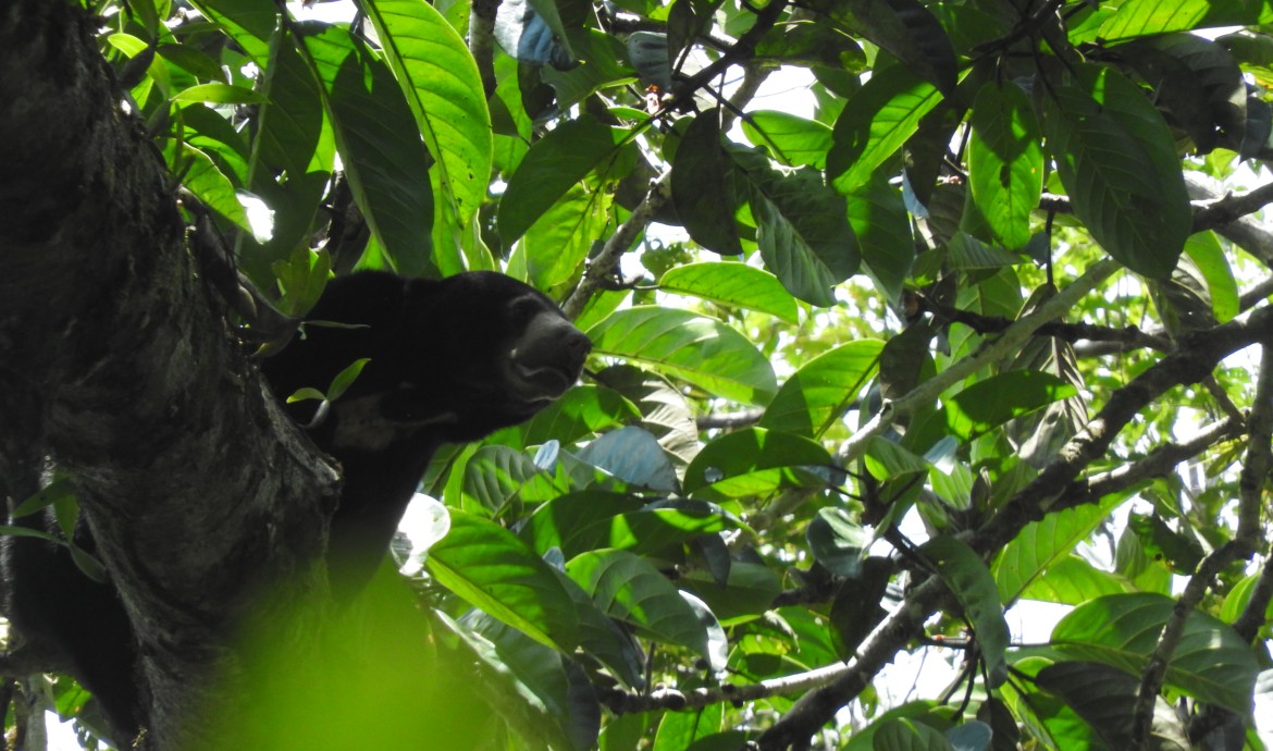 Adept tree climbers and the smallest of the bear species, sun bears are shy animals that prefer to be left alone. Our PRM team encountered one recently while observing a released orangutan named Desi. This particular sun bear was found eating small insects in the same tree as Desi. The team observed no signs of aggression between the two species as they went about their separate business in the same tree.