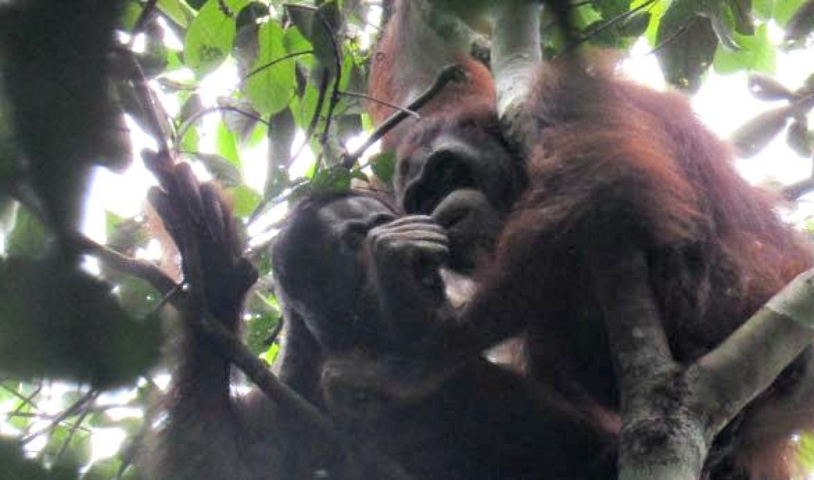 Our team from Nles Mamse Camp in the Kehje Sewen Forest recently observed Ajeng, a female orangutan we released back in September 2015. The team spotted her resting in the top of a tree and quickly began to record her activities, when suddenly a male orangutan approached her. The team didn’t recognise the male, so came to the conclusion that he was a wild orangutan.